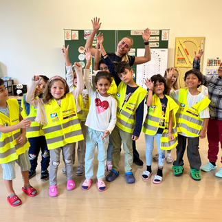 In den ersten Schulwochen besuchte uns eine Polizistin. Wir gingen gemeinsam spazieren und sie zeigte uns, wie man richtig über die Straße geht. Jetzt wissen wir, worauf wir im Straßenverkehr aufpassen müssen. Zum Abschluss bekamen wir sogar noch Warnwesten und Leuchtanhänger geschenkt!